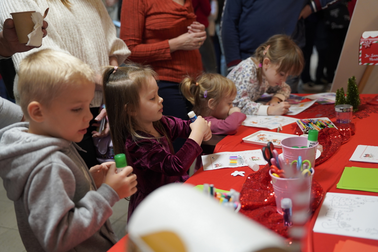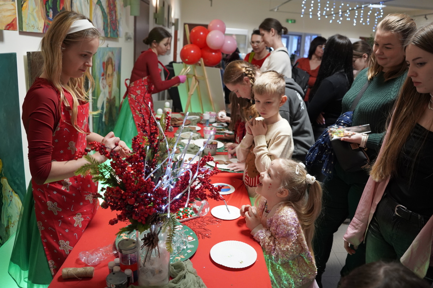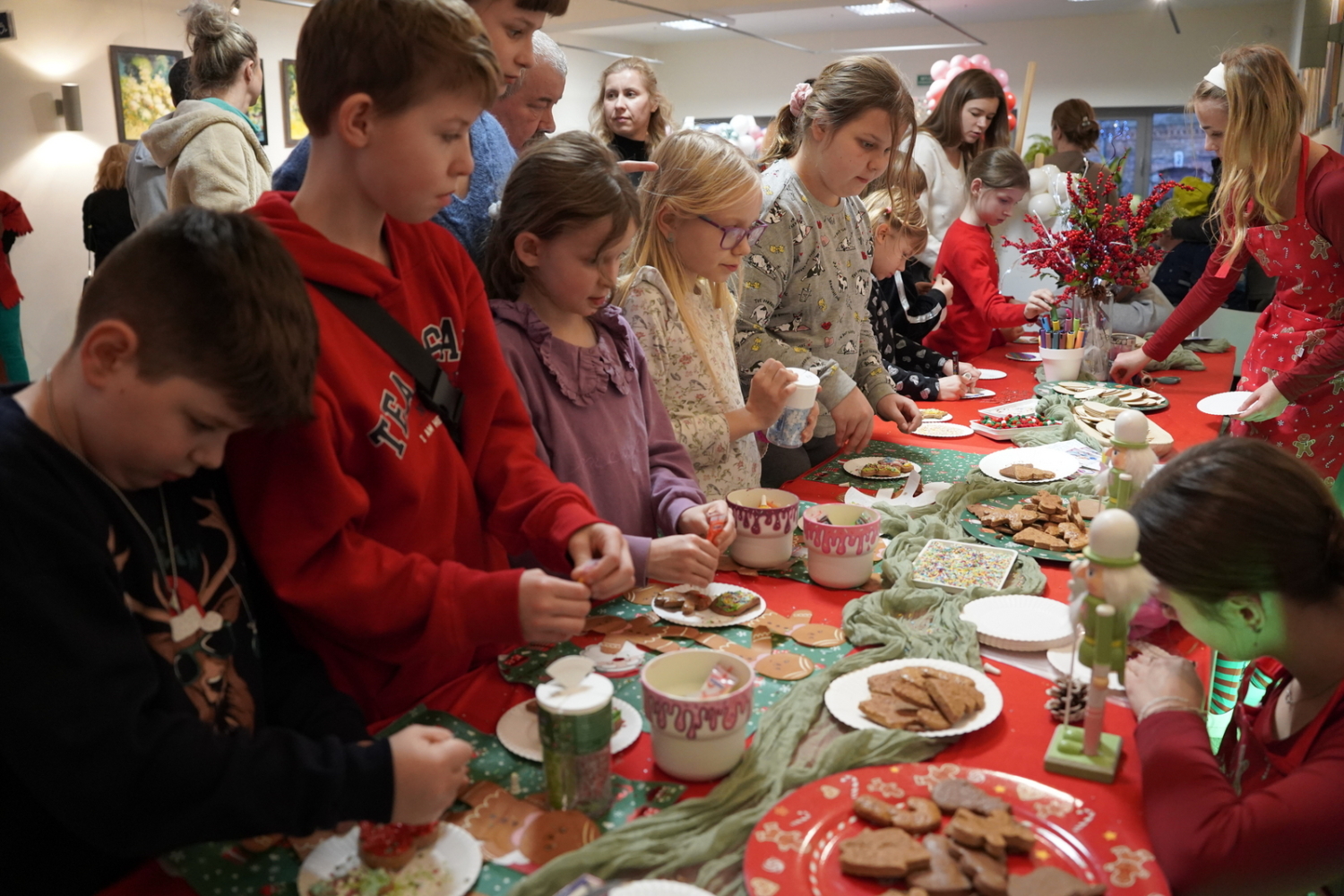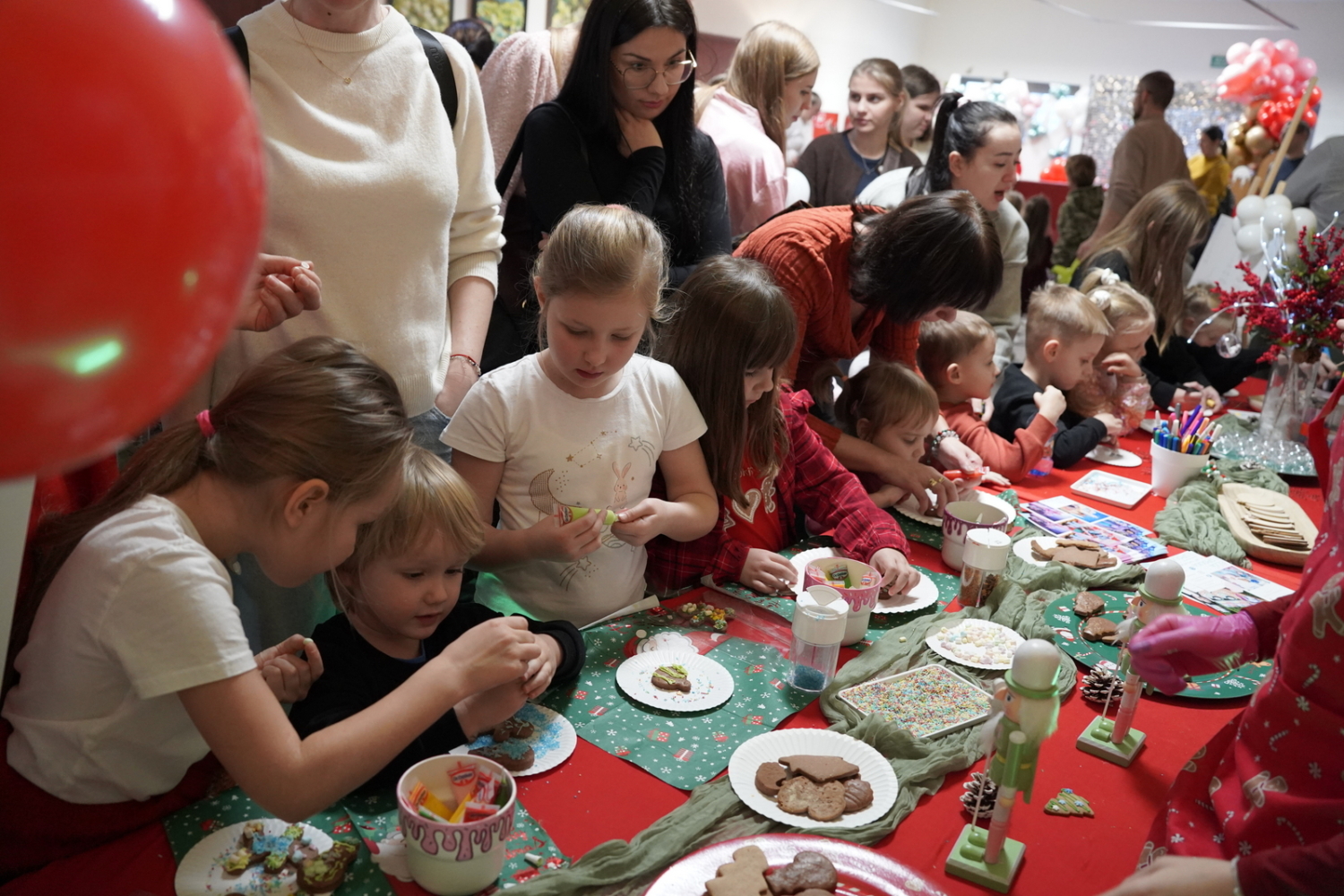 W budynku działała prawdziwa Pracownia Świętego Mikołaja, która zamieniła NOK w tętniący życiem, kolorowy świat pełen kreatywności. Dzieci dekorowały pachnące pierniczki, pisały listy do Świętego Mikołaja, ozdabiały bombki, tworzyły aniołki na choinkę i własnoręcznie robiły świąteczne kartki.