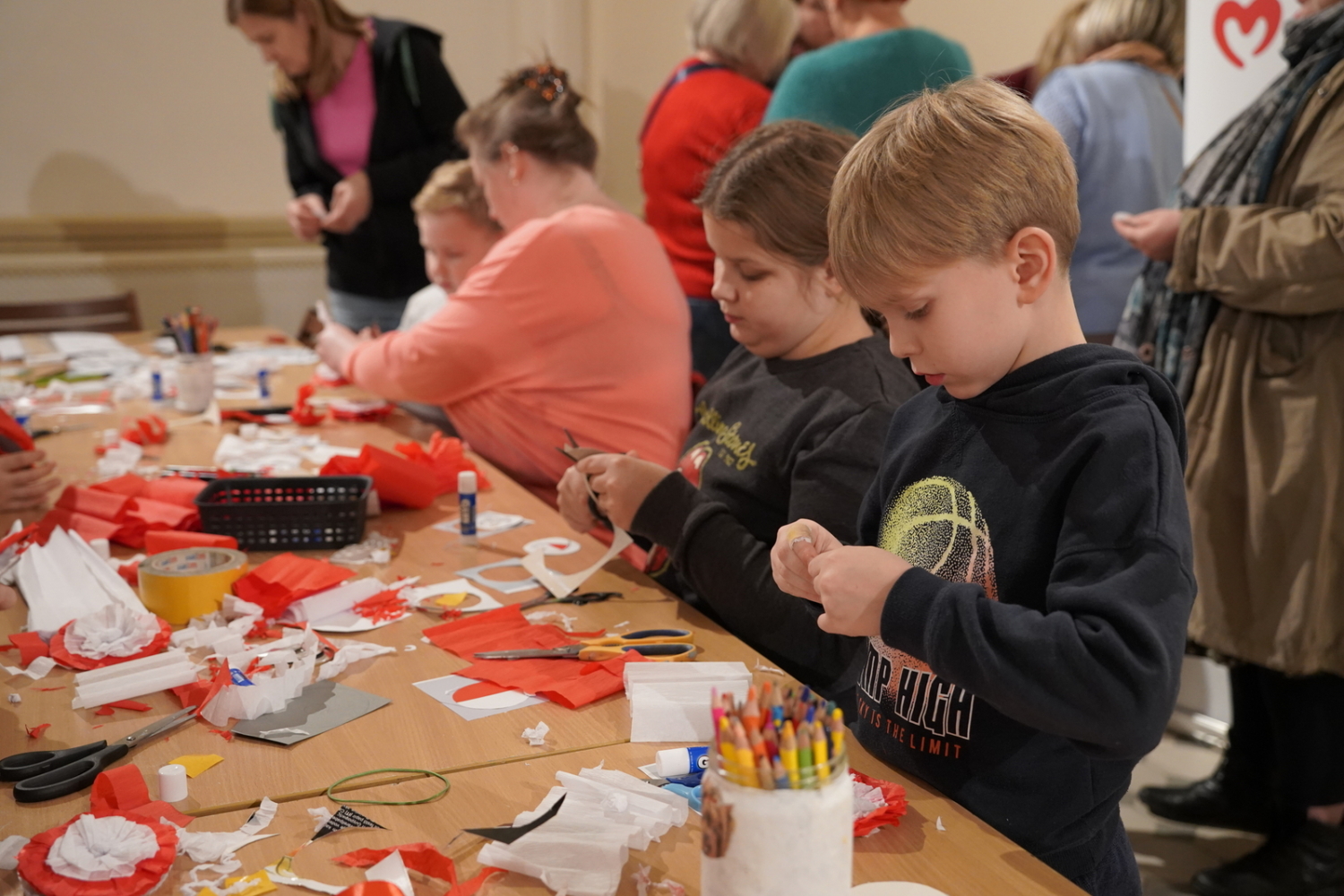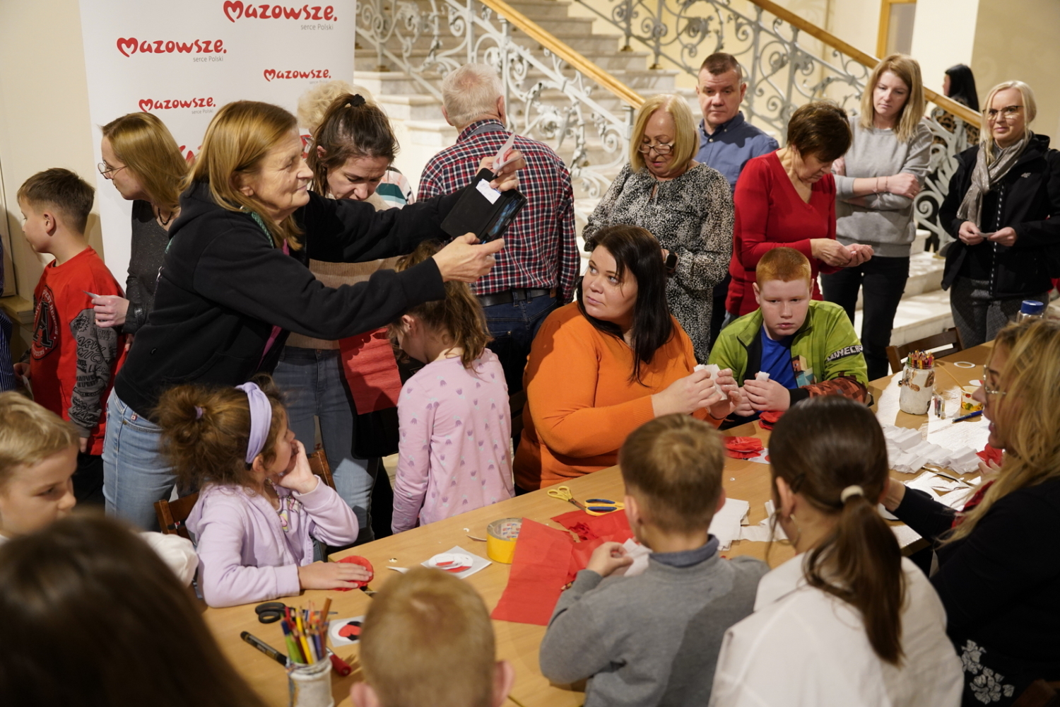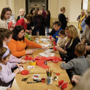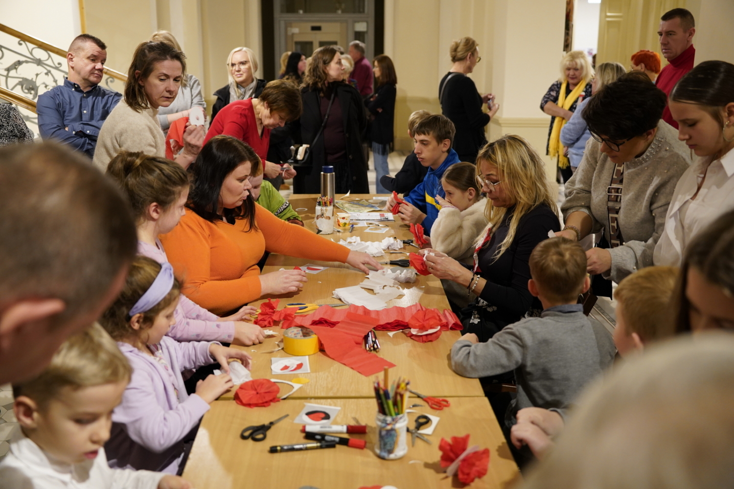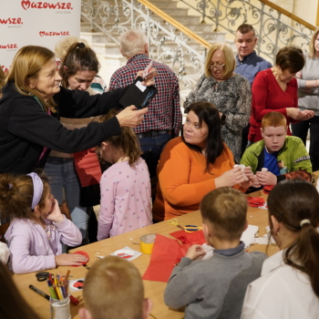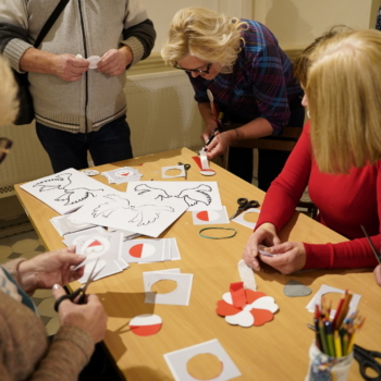 Chwilę później w budynku zrobiło się gwarno i kolorowo: podczas warsztatów tworzenia kotylionów przy jednym stole zasiedli dzieci, młodzież, dorośli i seniorzy. Wszyscy z zapałem wycinali, kleili i ozdabiali biało-czerwone symbole – prosta, wspólna zabawa zamieniła się w lekcję patriotyzmu i pokoleniowego porozumienia.