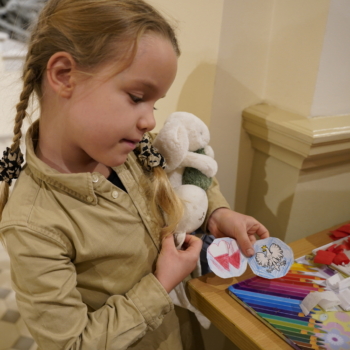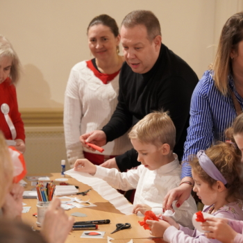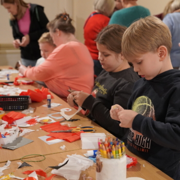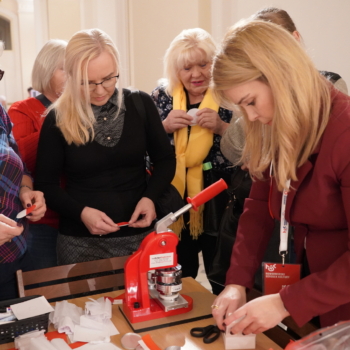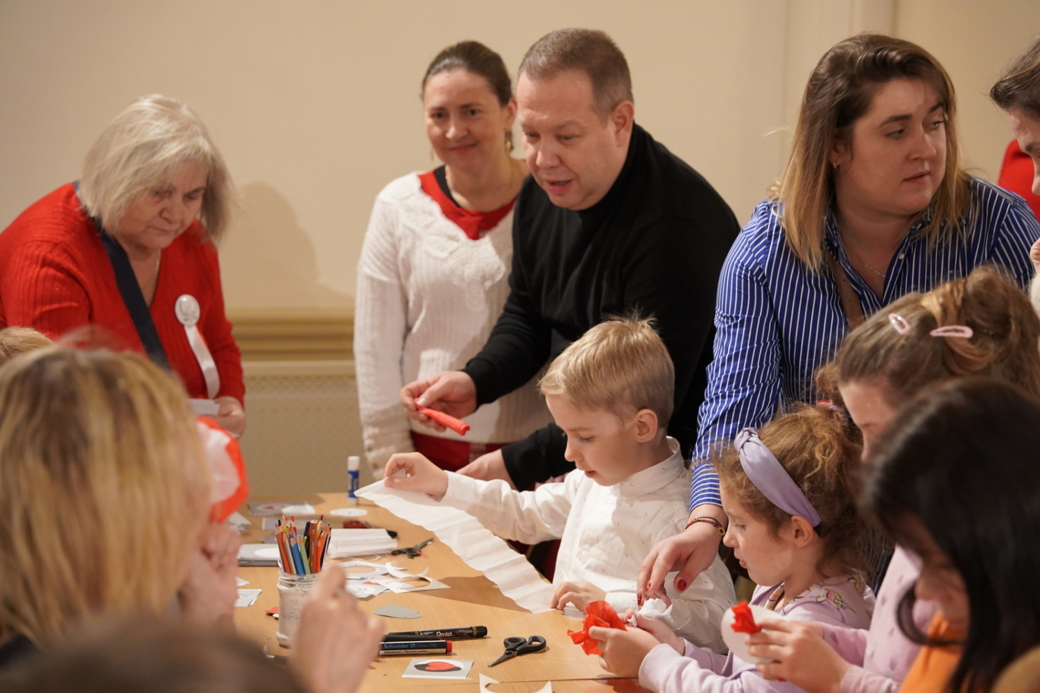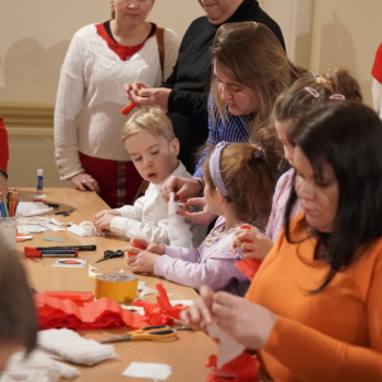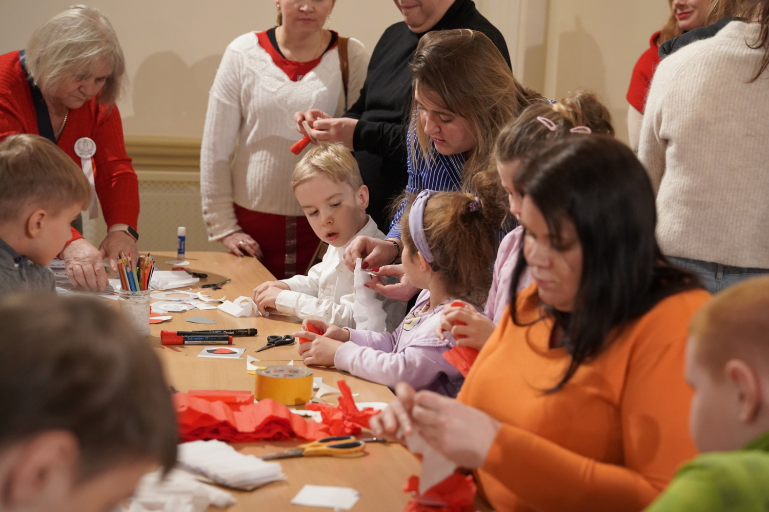 Chwilę później w budynku zrobiło się gwarno i kolorowo: podczas warsztatów tworzenia kotylionów przy jednym stole zasiedli dzieci, młodzież, dorośli i seniorzy. Wszyscy z zapałem wycinali, kleili i ozdabiali biało-czerwone symbole – prosta, wspólna zabawa zamieniła się w lekcję patriotyzmu i pokoleniowego porozumienia.