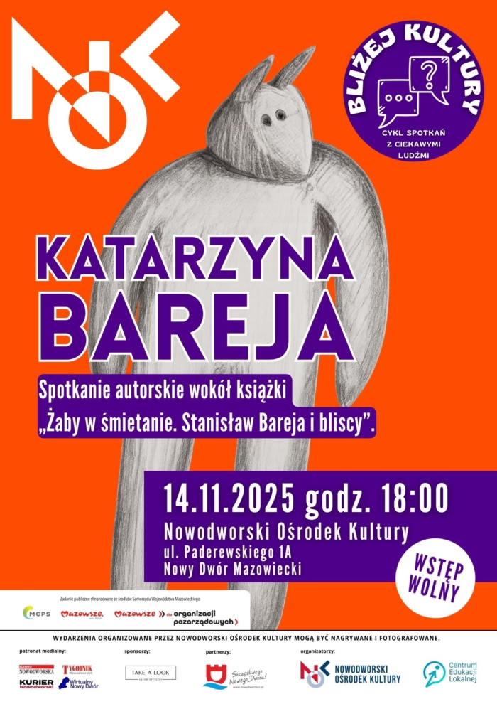 Nowodworski Ośrodek Kultury i Stowarzyszenie CEL – Centrum Edukacji Lokalnej, już 14 listopada, w ramach cyklu „Bliżej kultury”, zaprasza na wyjątkowe spotkanie autorskie z Katarzyną Bareją – córką Stanisława Barei, filmoznawczynią i psychoterapeutką.