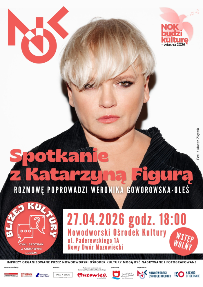 Nowodworski Ośrodek Kultury zaprasza na kolejne spotkanie z cyklu Bliżej Kultury. Tym razem gościem wydarzenia będzie Katarzyna Figura – jedna z najbardziej rozpoznawalnych i charyzmatycznych aktorek polskiego kina, teatru i telewizji. Spotkanie odbędzie się 27 kwietnia o godz. 18:00 w Nowodworskim Ośrodku Kultury przy ul. Paderewskiego 1A. Rozmowę poprowadzi Weronika Goworowska-Oleś.