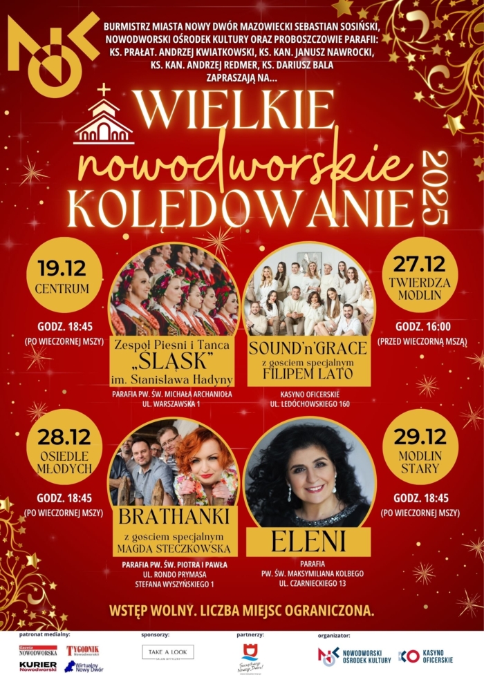 Burmistrz Miasta Nowy Dwór Mazowiecki Sebastian Sosiński, Nowodworski Ośrodek Kultury oraz Proboszczowie Parafii: ks. prałat Andrzej Kwiatkowski, ks. kanonik Janusz Nawrocki, ks. kanonik Andrzej Redmer, ks. Dariusz Bala mają zaszczyt zaprosić na: Wielkie Nowodworskie Kolędowanie 2025.